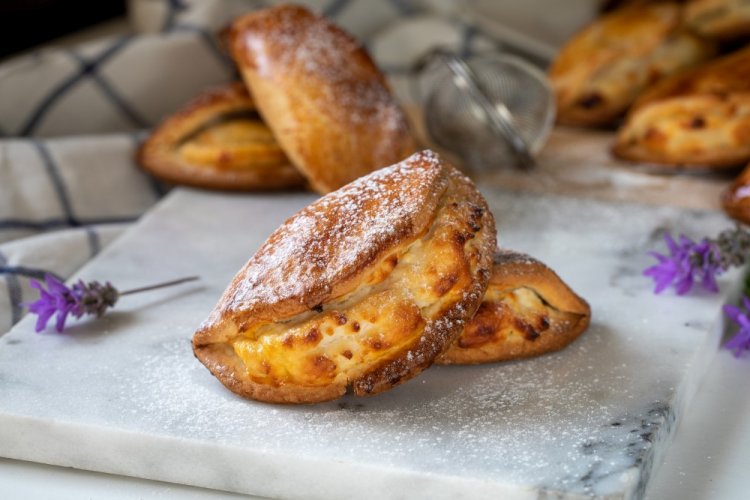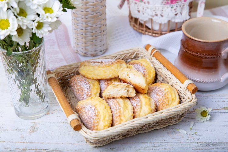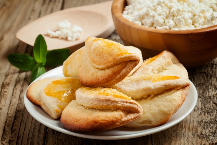 Приготовление: Смешай мягкое сливочное масло, сметану, яйцо, сахар и соль, а затем вмешай муку с разрыхлителем. Вымеси получившееся тесто и убери его на полчаса в холодильник. Для начинки отдельно взбей творог, оба вида сахара и яичный белок.