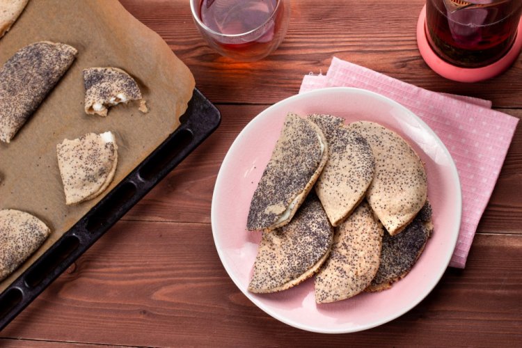 Для начинки смешай вместе перетертый творог, желток, сахар, сметану, мак и манку. Раскатай тесто, нарежь кружочки, выложи начинку и сложи сочники пополам. Смажь их оставшимся белком и выпекай 25 минут в духовке при 180 градусах.
