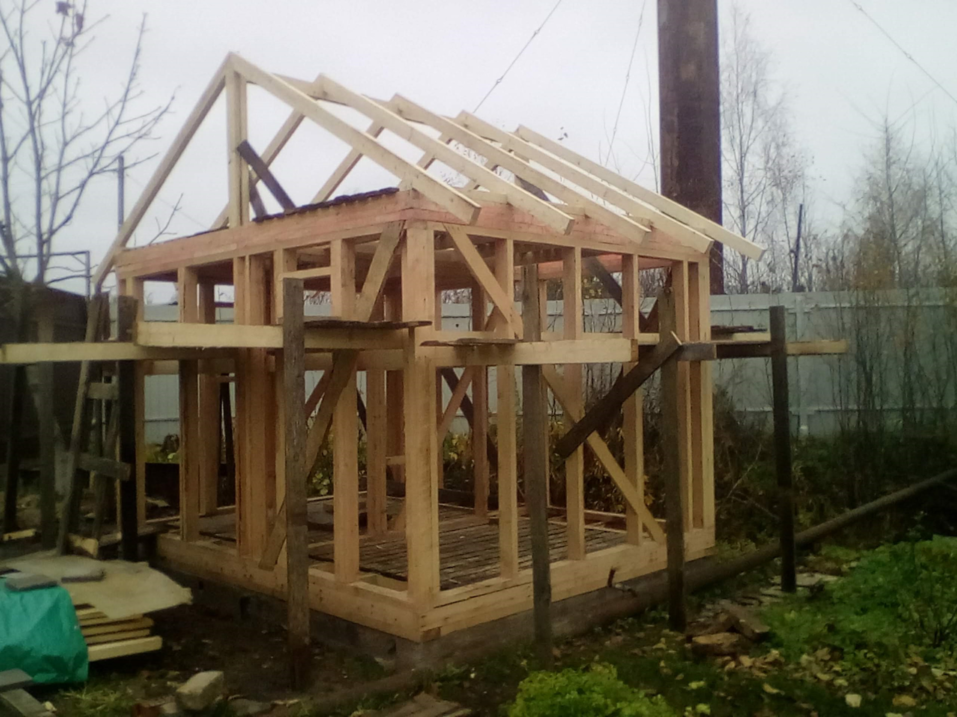 После сборки 15 венцов я установил потолочные балки — это сделало работу на высоте безопаснее и удобнее. Затем приступил к монтажу стропильной системы, сделал обрешетку и накрыл крышу ондулином — надежным и практичным кровельным материалом.